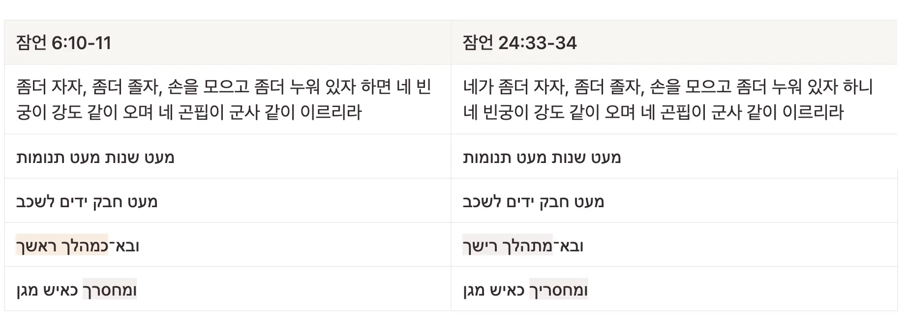 위 두 구절은 사실상 그 의미가 동일하다. 그런데 원문을 보면 세세한 표현 방식에 있어 동사나 접미어의 사용방식이 다름을 알 수 있다. 비평적인 관점에서 이를 다른 문서층, 혹은 필사상의 문제로 상정할 수도 있지만, 구전과 기억을 중심으로 한 전승과정의 측면에서 보자면 이는 지극히 자연스러운 현상이라 할 수 있다.