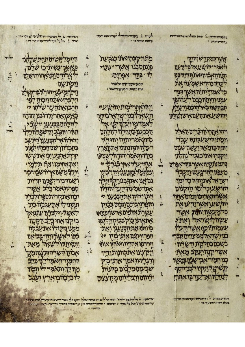 벤 아셰르는(?~960) 가장 정확한 마소라 본문을 작성한 이라고 평가 받는 인물이다. 그렇다면 여기서 마소라 본문이 무엇인지 개략적으로 짚고 넘어가야 할 것 같다. 출판 기술이 발달되기 전, 모든 문서는 손으로 직접 필사되어야만 했다. 따라서 필사 과정 가운데 실수가 발생하는 것은 당연한 것이었다. 그러나 거룩한 하나님의 말씀은 실수 없이 전달되어야 했기에 실수를 방지하기 위한 장치를 부가했는데, 그것이 바로 마소라 기호이다. 마소라 기호는 점과 선,그리고 히브리어 문자 등을 통해 본문이 잘못 필사되지 않도록 한 특별한 장치이다. 이에 대해서는 나중에 자세히 알아볼 것이다.