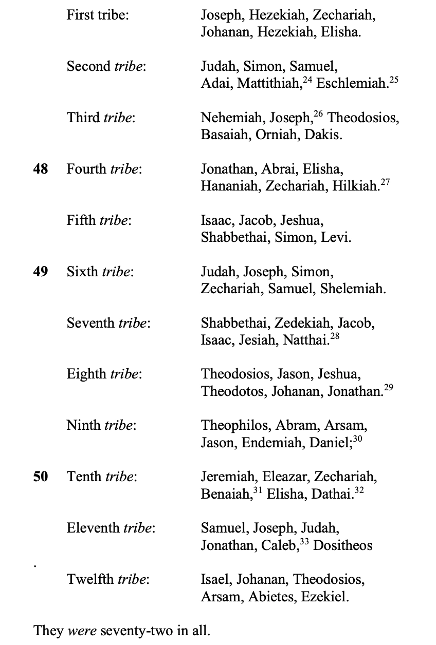 본 문서에 따르면, 당시 알렉산드리아의 정치인이자 도서관장이었던 Demetrios of Phaleron가 그리스어로 번역된 히브리 법전을 도서관에 비치해 둘 것을 요청하였고, 이에 프톨레미 2세는 막대한 선물을 예루살렘 성전에 보내면서, 히브리 성서를 그리스어로 번역해 줄 것을 요청하였다. 이에 대제사장은 각 지파별로 6명의 번역가를 선발하였고, 72명의 번역가들이 72일 동안 성서 번역을 마쳤다.