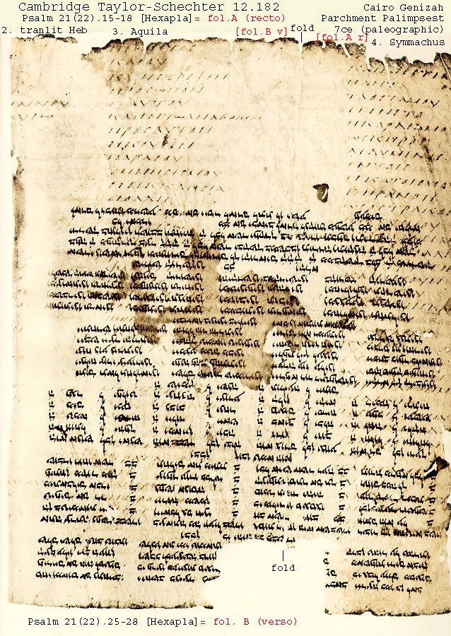 카이로 그니자에서 발견된 재활용 문서. 윗부분에 희미하게 남아 있는 글자(그리스어)가 헥사플라의 흔적이다.