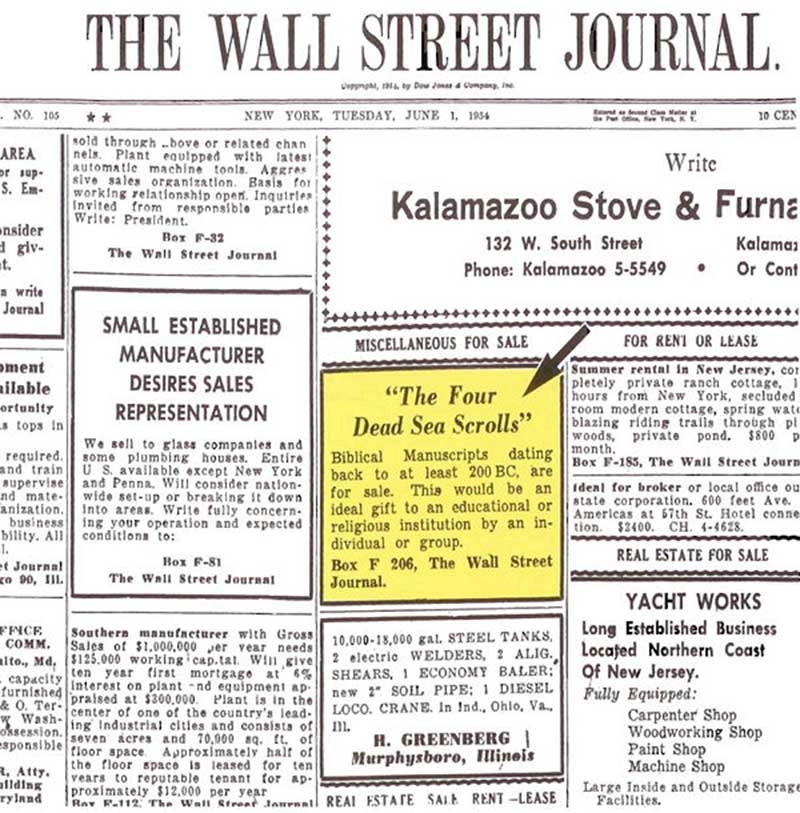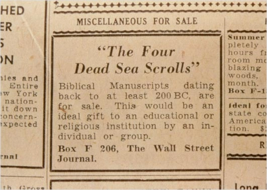 사무엘 대주교는 당시 팔레스틴의 정치적인 불안 때문에 사본들을 다른 곳으로 옮겨야 한다고 주장했고, 그는 미국으로 가져가 판매하려고 했지만, 소유권 문제 때문에 거래가 잘 이루어지지 않게 된다. 그리고 그는 월스트리트 저널 1954년 6월 1일자 신문에 이 두루마리를 판매한다는 광고를 조그맣게 낸다.