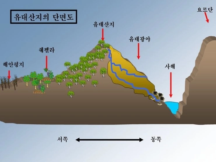 사해는 예루살렘의 동편 50km 정도 떨어진 곳에 위치해 있다. 지형적으로 보면, 예루살렘이 높은 산지를 이루고 계속해서 동편 비탈길을 따라 내려가면, 유대 광야에 이르게 된다. 예루살렘에서 동편 유대 광야 쪽으로 내리막길을 따라 계속 내려가다 보면 해발고도 0m, 즉 지중해 해수면의 위치와 동일한 지점(the sea level)을 지나가게 된다. 그 지역을 넘어가면 나오는 사해는 그보다 400미터 더 아래쪽에 위치한다. 이러한 지형으로 인해 극단적인 푄 현상으로 메마른 광야 지대가 형성되었다.