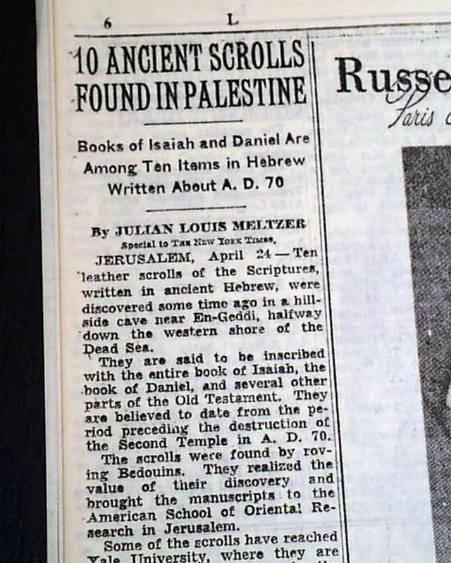 예일대는 어제 팔레스틴에서 현존하는 가장 오래된 이사야서 사본을 발견했다고 발표했다. 이 사본은 예루살렘의 성마가 시리아 교회에서 발견되었으며, 기원전 1세기 경의 것으로 추정되는 양피지 두루마리에 기록되어 있었다. 최근 이 두루마리의 정체는 예루살렘의 미국 동방 연구소의 학자들에 의해 밝혀졌다. 이 연구소에서 3개의 다른 고대 히브리어 두루마리들을 검토했는데, 하나는 하박국서 주석이었고 다른 하나는 잘 알려지지 않은 종파 혹은 수도 공동체, 아마도 에세네의 규율서로 보인다. 세번째 두루마리는 무엇인지 알려지지 않았다.