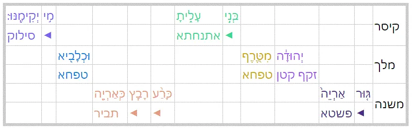 이사야 7:3a는 하나님께서 이사야에게 그의 아들 스알야숩(שאר ישוב)을 데리고 아하스에게 가라는 말씀이 기록되어 있다. 그런데 위의 테아밈 구조를 보면 이사야의 아들의 이름 스알야숩이 테아밈에 의해 분절되고 있다. 즉 שאר와 ישוב이 분리된다. 사람의 이름을 구문적으로 분절하는 것은 매우 이상해 보인다.