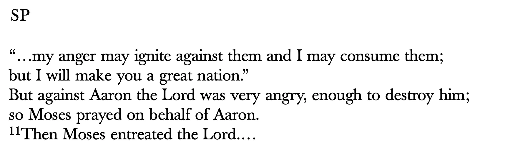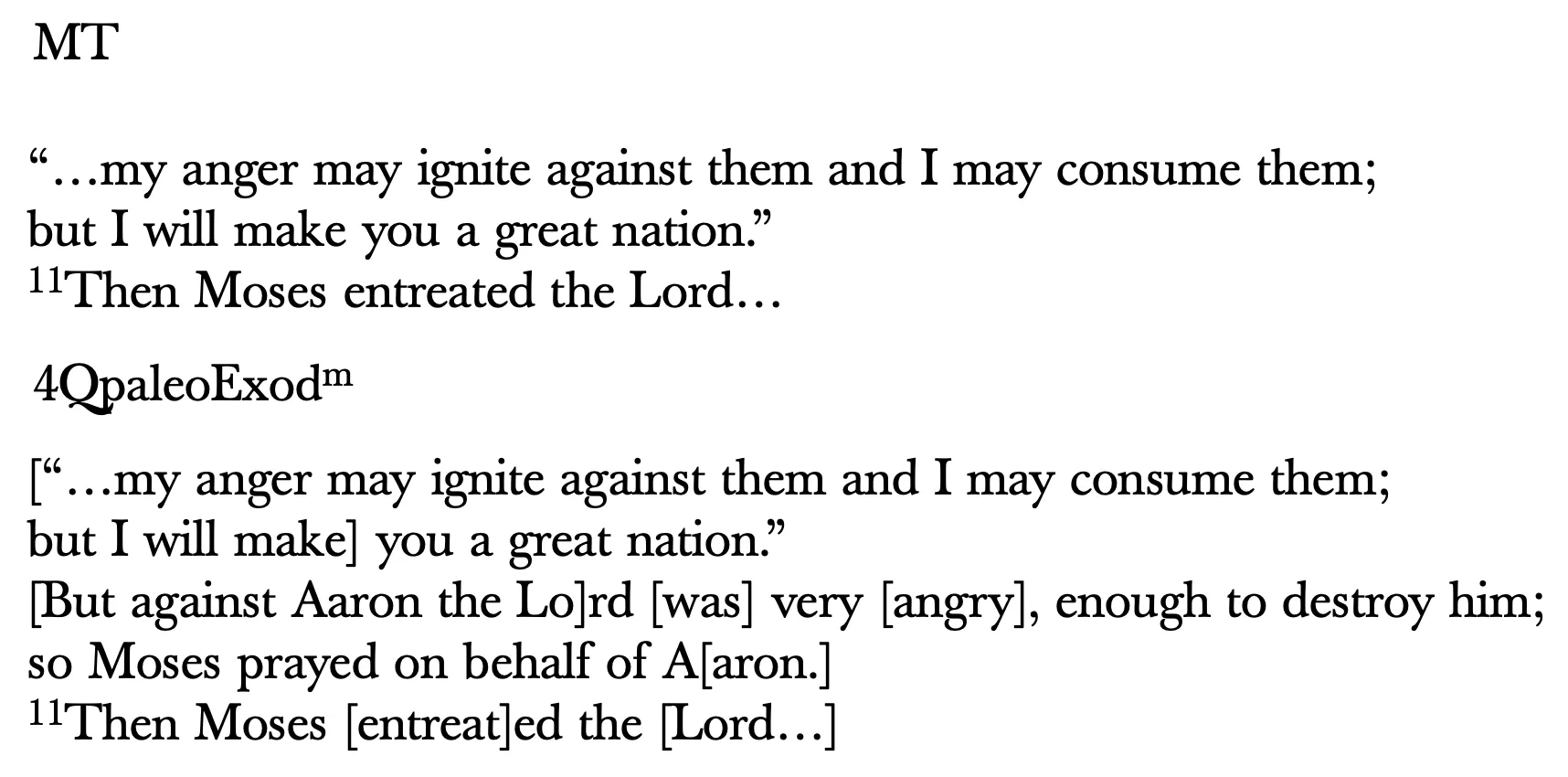 여기서 쿰란 문헌(기원전 50년경)은 보다 확장된 형태의 본문(신 9:20의 내용을 함축)을 나타내고 있다(사마리아 오경).