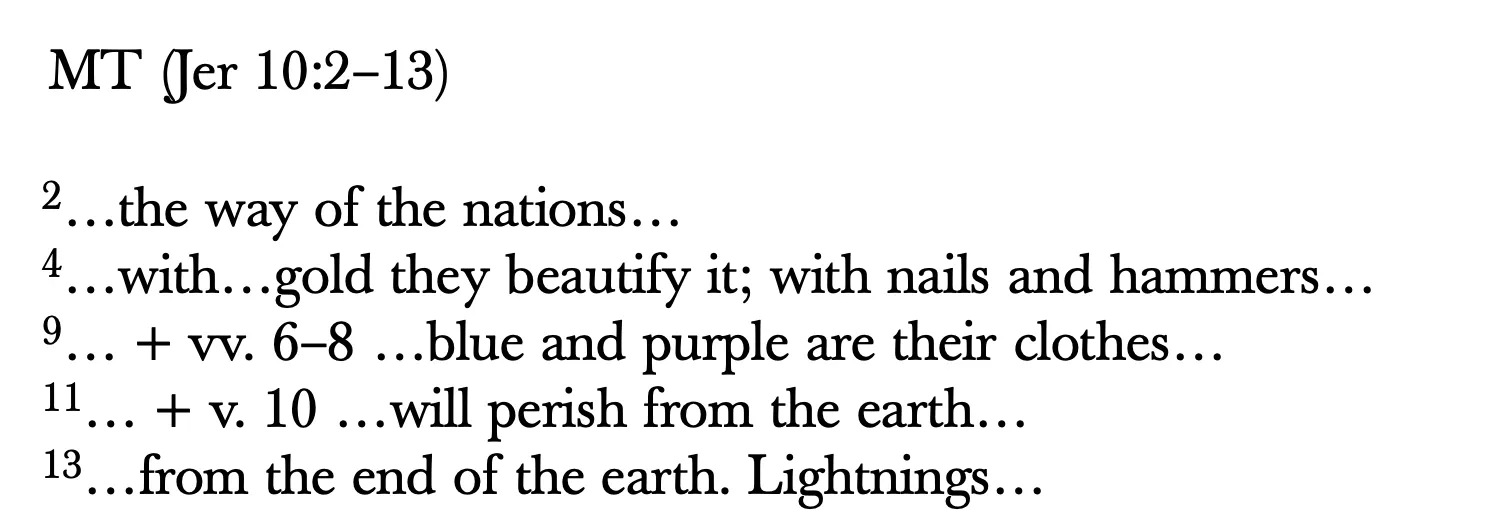 마소라 본문과 70인역은 본문의 길이와 순서가 다르다. 마소라 본문은 훨씬 더 긴 본문을 가지고 있다. 위를 비교해볼 때 70인역이 마소라보다 더 앞선 본문으로 보이고, 이렇게 짧은 본문의 본래 히브리어 버전을 쿰란 문헌에서 찾아볼 수 있다.
