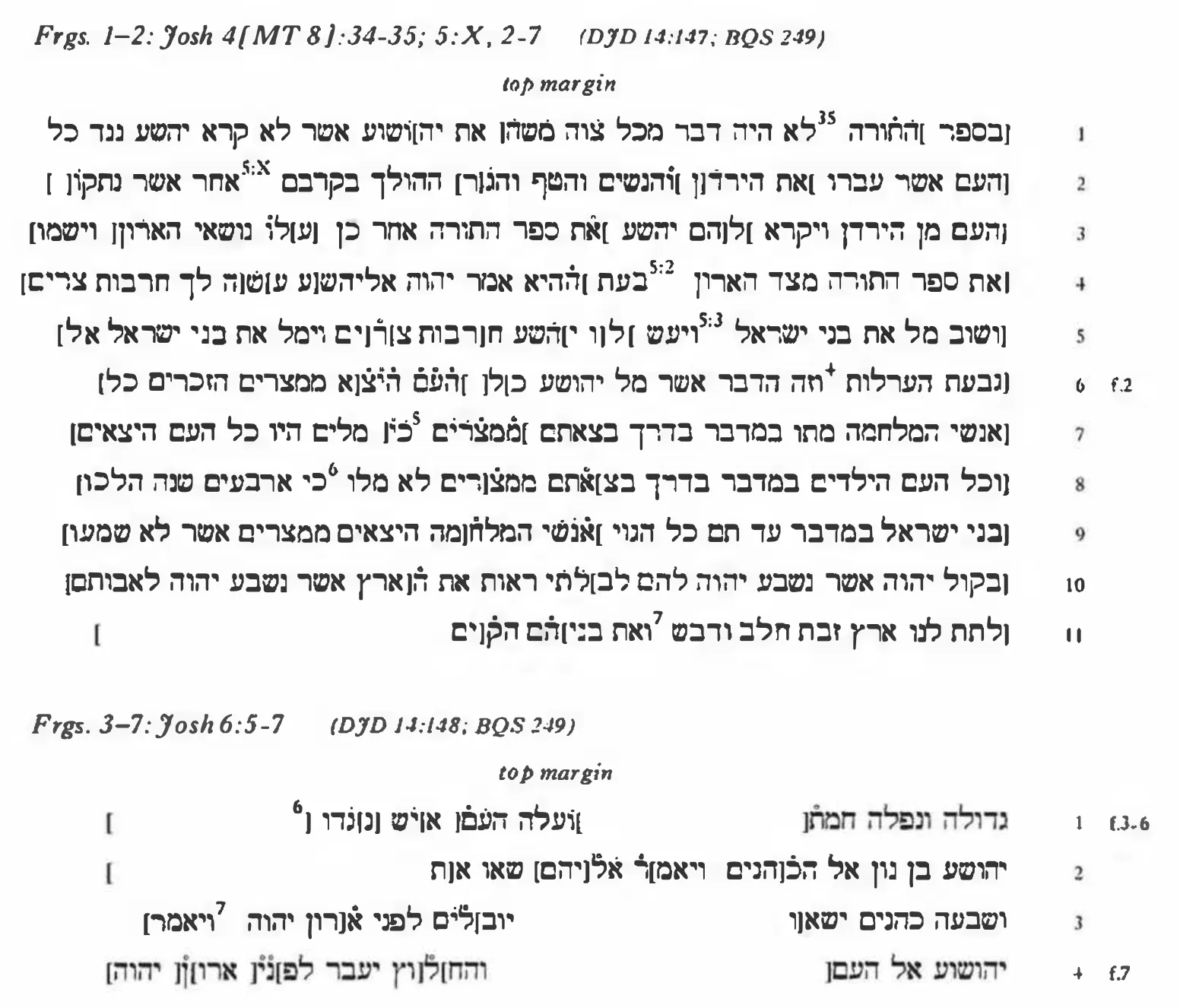 그런데 마소라와 70인역은 이를 8장의 마지막에 언급하고 있음. 그리고 그 첫번째 제단을 에발산으로 규정하고 있음(8:30). 쿰란 문서는 보다 앞선 전통을 표현하고 있는 듯. 요세푸스(고대사 Book 5. 1.4) 역시 이를 지적.