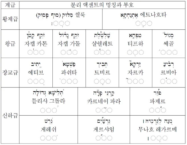 [표 출처] 권성달, “성경 히브리어 엑센트에 대한 고찰,” 성경원문연구 제23호, 2008, 107쪽.