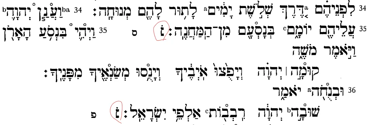 예를 들어 이 표시는 민 10:34와 10:36 다음에 나타나고 있는데, 민10:34-36은 본문 상에서의 위치가 자연스럽지 않아 보인다. 랍비 주석 민수기 Sifre는 84항에서 민10:35-36 이전과 이후에 점이 찍혀 있음을 언급하고 있다. 그리고 이 점들은 본래의 자리가 아님을 표시하는 것이라 언급한다. 물론, 랍비 문헌은 분명히 특정한 글자가 아니라 점들로 이러한 표시가 되어 있다고 언급하고 있다. 그런데 여기서 “점”을 의미하는 히브리어 단어는 נקוד (나쿠드)인데, 학자들은 점을 가리키는 이 표현과 뒤집혀진 눈을 연관시키려 한다. 또 다른 예로 시편 107:21-26과 40절도 이에 해당될 수 있다.