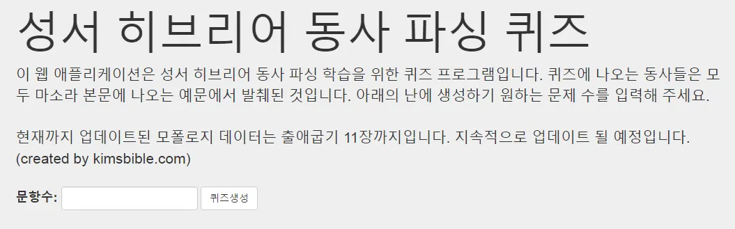 본 프로그램은 필자가 계획하고 있는 성서 문학 분석 프로그램의 일부로 만들어진 것이며, 앞으로도 오답노트, BDB 사전 링크, PDF 형태로 문제 다운로드 등과 같은 기능들을 시간이 날 때마다 추가할 예정입니다.