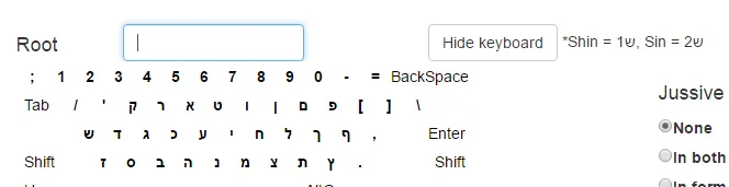 그리고 그 아래에는 위 그림과 같은 화면이 있는데 답을 입력하는 부분입니다. Root에는 문제 동사의 어근을 직접 입력하면 됩니다. 히브리어 자판이 설치되지 않은 컴퓨터 사용자는 오른쪽에 Show keyboard를 클릭하면 아래와 같이 가상 히브리어 키보드가 뜨는데 마우스로 해당 글자를 입력할 수 있습니다. 작성 후에는 Hide keyboard를 클릭하여 가상 키보드를 제거하시면 됩니다. 참고로 키보드 상에서는 쉰(שׁ)과 신(שׂ)을 구별할 수 없는데, 가상 키보드 옆의 지침대로 쉰은 ש1을, 신은 ש2로 각각 입력하면 됩니다. 그리고 어근의 마지막 자음이 종결형을 갖는 경우(예. מ/ם, כ/ף) 종결형을 정확하게 입력해 주셔야 합니다.