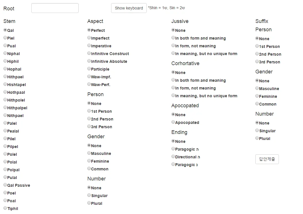 Stem은 문제에 제시된 히브리어 동사가 어떤 형의 동사인지를 선택하는 것입니다. 대부분은 Qal ~ Hithpael 까지 6개의 항목에 포함되나, 성서 히브리어 본문에는 변칙적인 동사형들이 적지 않게 나타나고 있기 때문에 이 모든 형태를 모함시켰습니다.
