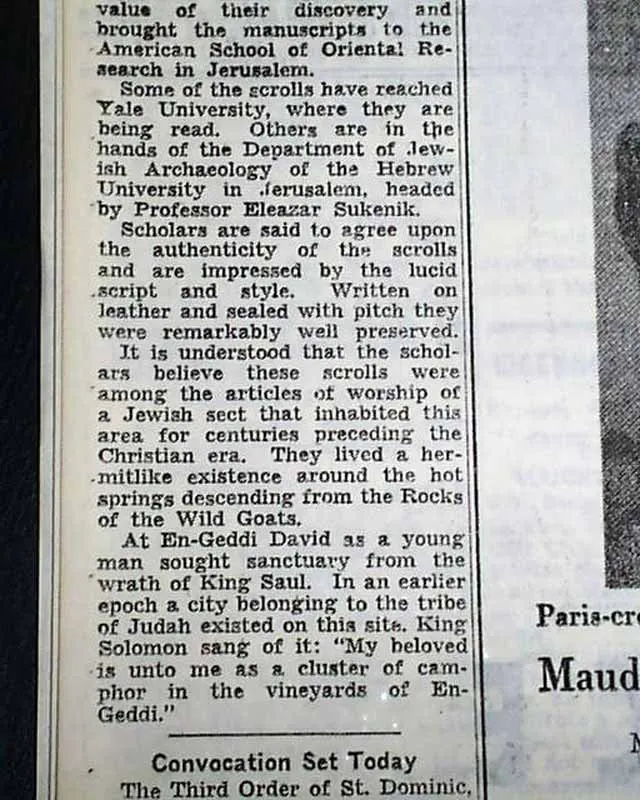 예일대는 어제 팔레스틴에서 현존하는 가장 오래된 이사야서 사본을 발견했다고 발표했다. 이 사본은 예루살렘의 성마가 시리아 교회에서 발견되었으며, 기원전 1세기 경의 것으로 추정되는 양피지 두루마리에 기록되어 있었다. 최근 이 두루마리의 정체는 예루살렘의 미국 동방 연구소의 학자들에 의해 밝혀졌다. 이 연구소에서 3개의 다른 고대 히브리어 두루마리들을 검토했는데, 하나는 하박국서 주석이었고 다른 하나는 잘 알려지지 않은 종파 혹은 수도 공동체, 아마도 에세네의 규율서로 보인다. 세번째 두루마리는 무엇인지 알려지지 않았다.