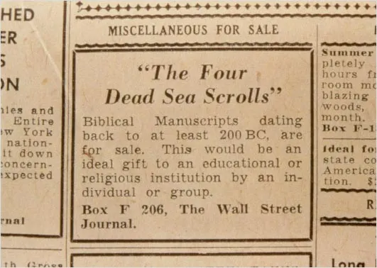 사무엘 대주교는 당시 팔레스틴의 정치적인 불안 때문에 사본들을 다른 곳으로 옮겨야 한다고 주장했고, 그는 미국으로 가져가 판매하려고 했지만, 소유권 문제 때문에 거래가 잘 이루어지지 않게 된다. 그리고 그는 월스트리트 저널 1954년 6월 1일자 신문에 이 두루마리를 판매한다는 광고를 조그맣게 낸다.