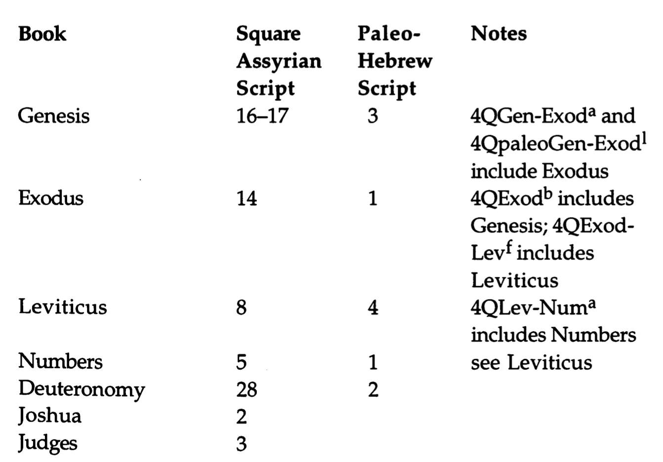 위와 같은 통계는 쿰란 공동체 당시 대부분 정방형의 글자로 성서가 필사되었지만, 일부 본문의 경우 여전히 고대 히브리어 문자로 작성되었음을 알 수 있다. 물론, 당시까지도 상징적인 기호로써 고대 히브리어 문자가 사용된 예가 있다. 아마도 소수의 고대 히브리어로 된 사본들이 발견되는 것은 고대 히브리어 글자 자체가 가지고 있는 권위 때문이었을 것으로 추정된다.