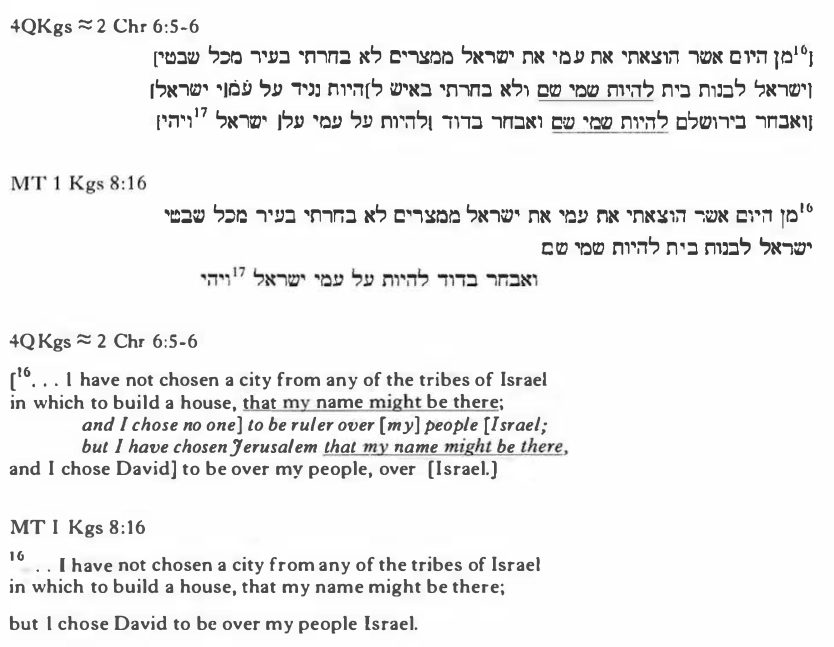 마소라 본문은 위 4QKgs의 이탤릭체로 표시된 부분을 모두 생략하고 있다. 아마도 להיות שמי שם가 중복되어 있는 부분을 혼동했던 듯하다. 그리고 이 부분은 역대기에 보존되어 있다. 즉, 마소라 본문에서 생략된 부분을 쿰란 문서를 통해 발견할 수 있으며, 쿰란 문서가 보다 오래된 본문 전승을 보여준다고 볼 수 있다.