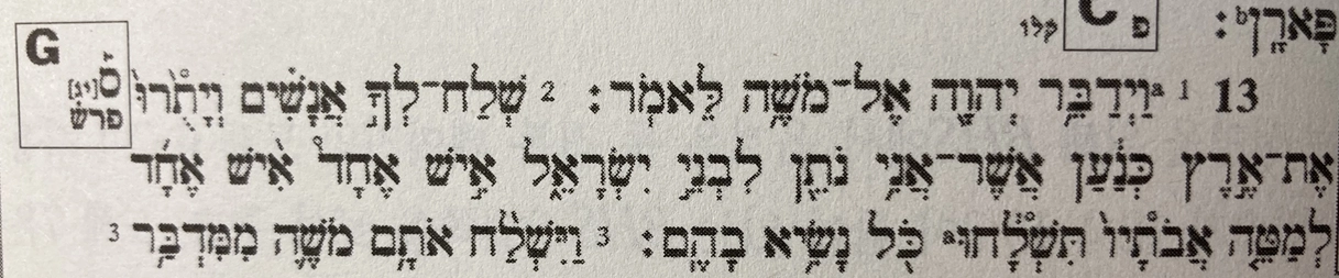 현대 마소라 편집본(BHS). G 부분의 큰 ס은 팔레스틴 전통의 세데르 단락구분, 그리고 פרש는 바벨론 전통의 파라숏 단락 구분 표기이다.