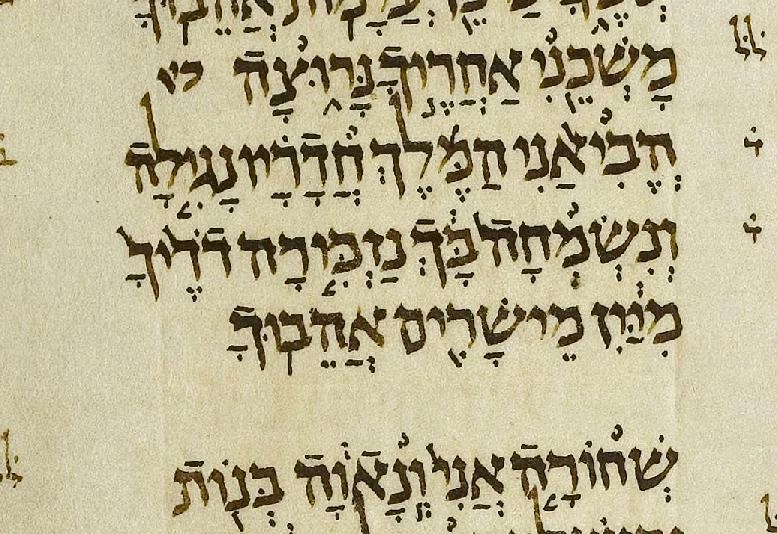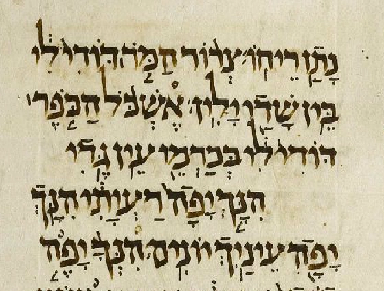 그런데 나중에 주된 본문으로 채택된 마소라 본문을 전승시켰던 마소라 학파의 경우, 자음으로 된 본문 그 자체에 큰 권위를 두고 있었다. 그리고 그들이 전승받았던 그대로의 자음 텍스트를 유지하면서 올바르게 읽는 방식을 안내하는 장치를 부가 하였는데 그것이 바로 히브리어 모음 체계(niqud)이다. 아래의 예를 보면 왜 히브리어 모음 부호가 글자 위아래, 그리고 중앙에 부가되었는지를 알 수 있다. 마소라 학파는 있는 그대로의 자음 본문을 완벽하게 유지하면서 모음 부호를 부가하였다.