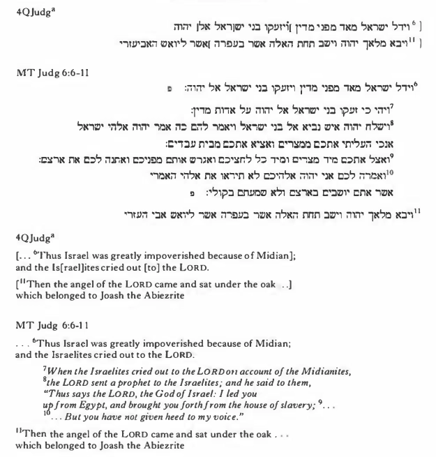 쿰란 4번동굴에서 발견된 이 사본은 가장 오래된 사사기 사본으로 기원전 50-25년경에 작성된 것으로 추정된다. 이 사본은 한 파편만이 남아 있는 채로 발견되었다. 이 사본은 사사기 6:2-6, 11-13이 포함되어 있으나 7-10절은 포함되어 있지 않다. 학자들은 이스라엘 백성들이 부르짖었을 때 하나님께서 예언자를 보내셨다고 적고 있는 7-10절은 본문의 흐름을 깨는 것으로 읽히기 때문에 신명기사가적 삽입구라고 보았다. 그렇다면 이 본문이 사사기 본문의 발전단계에 있어 초기 본문 증거라고 할 수 있을까?