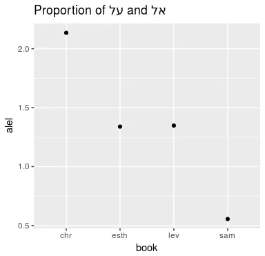이 데이터를 על의 사용 수 / אל의 사용 수 공식을 이용하여 사용 비율 값을 구한 뒤 아래와 같이 점 그래프로 표현해 보았습니다. 값이 크면 클 수록 על의 사용 비율이 보다 높다는 의미입니다.