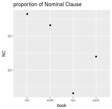 그리고 레위기와 에스더서의 경우를 보면 레위기는 명사절보다는 동사절의 비율이 크게 나타나는 것을 볼 수 있습니다. 명사절의 비율만 놓고 본다면 레위기는 포로 후기의 문체를 보이고 있지는 않은 것 같습니다. 반면 에스더서는 명사절 비율이 높게 나타나는데 이는 에스더서가 포로 후기의 문체를 전형적으로 나타내 보이고 있는 것 같습니다. 좀 더 그 차이를 확실히 하기 위해 각 책의 명사절 요소들의 비율을 모두 합산하여 점 그래프로 아래와 같이 만들어 보았습니다.